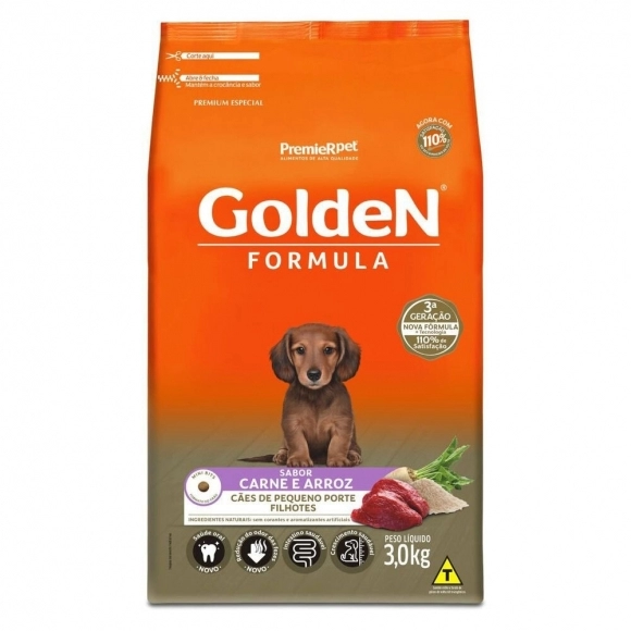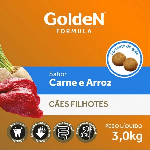 Golden Formula Filhotes Carne & Arroz é um alimento Premium Especial completo e visa, acima de tudo, proporcionar aos cães o nível ideal de todos os nutrientes que eles necessitam para um crescimento forte e saudável.