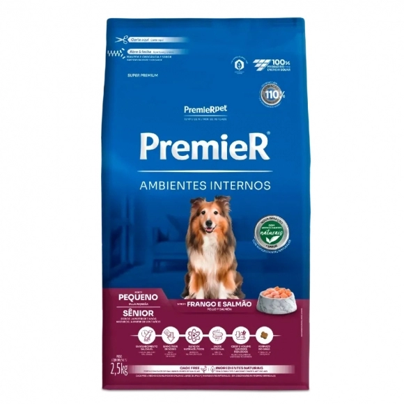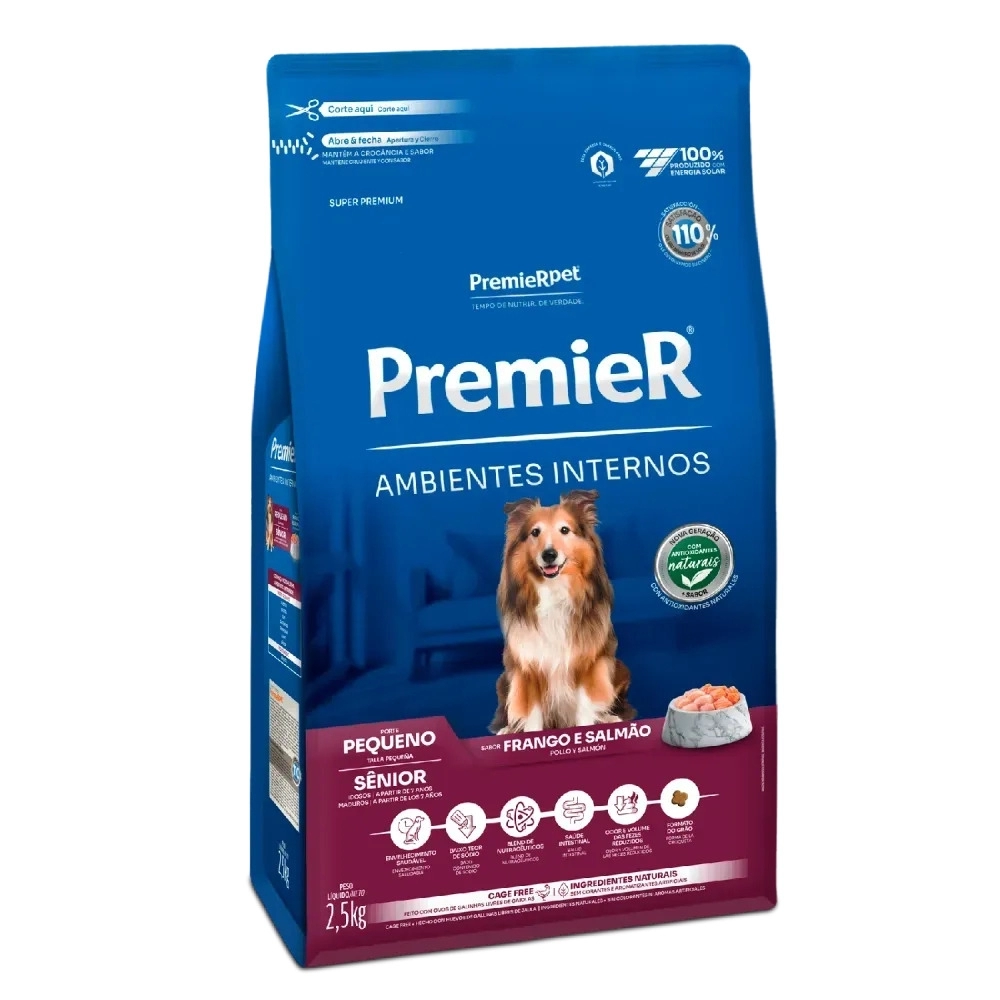 PremieR Ambientes Internos Senior é um alimento Super Premium específico para cães idosos que vivem dentro de casa.