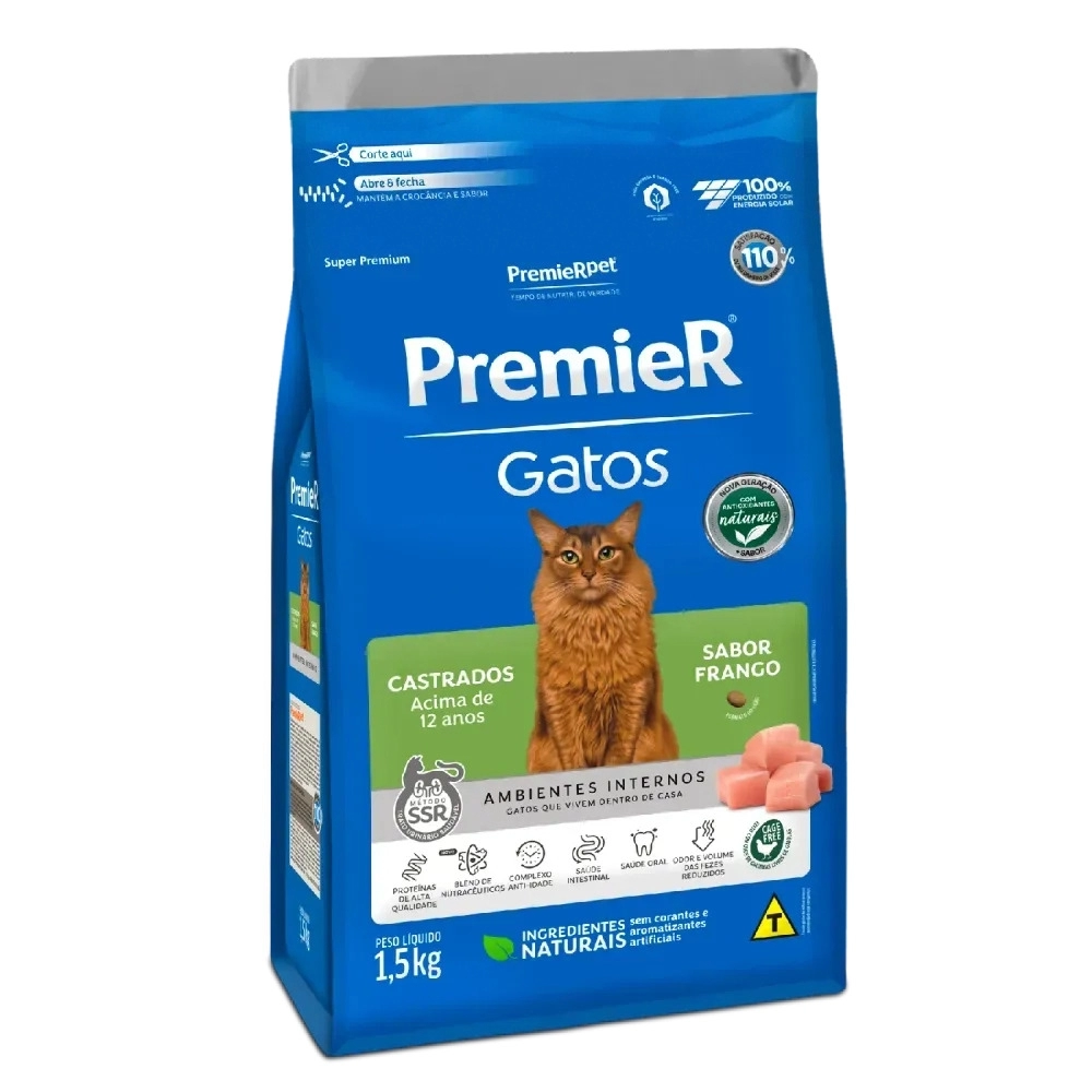 PremieR Gatos Castrados acima de 12 anos – Frango é um alimento Super Premium que faz parte da linha PremieR Gatos Castrados, uma linha de alimentos especialmente desenvolvida para garantir o máximo em saúde e vitalidade aos gatos através de cuidados nutricionais específicos pós castração.