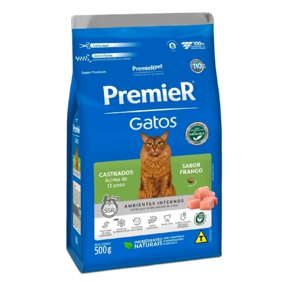 PremieR Gatos Castrados acima de 12 anos – Frango é um alimento Super Premium que faz parte da linha PremieR Gatos Castrados, uma linha de alimentos especialmente desenvolvida para garantir o máximo em saúde e vitalidade aos gatos através de cuidados nutricionais específicos pós castração. Com foco em promover a manutenção do peso ideal e a saúde do trato urinário nos gatos castrados, estes alimentos apresentam-se divididos por faixa etária, já que tanto o peso quanto a incidência dos cálculos urinários varia em função da idade.