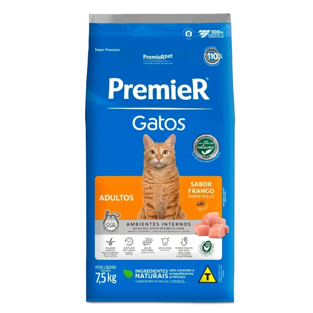 PremieR oferece ao seu gato adulto uma refeição especial todos os dias. Além de um sabor insuperável, ele apresenta uma combinação exclusiva de ingredientes nobres que deixam a pelagem muito mais bonita e brilhante. Para a saúde do trato urinário, PremieR Gatos Adultos – Frango acidifica naturalmente a urina, controlando a formação dos indesejáveis cálculos urinários. PremieR Gatos Adultos – Frango conta também com uma poderosa ação antitártaro, proporcionando uma ótima saúde bucal.