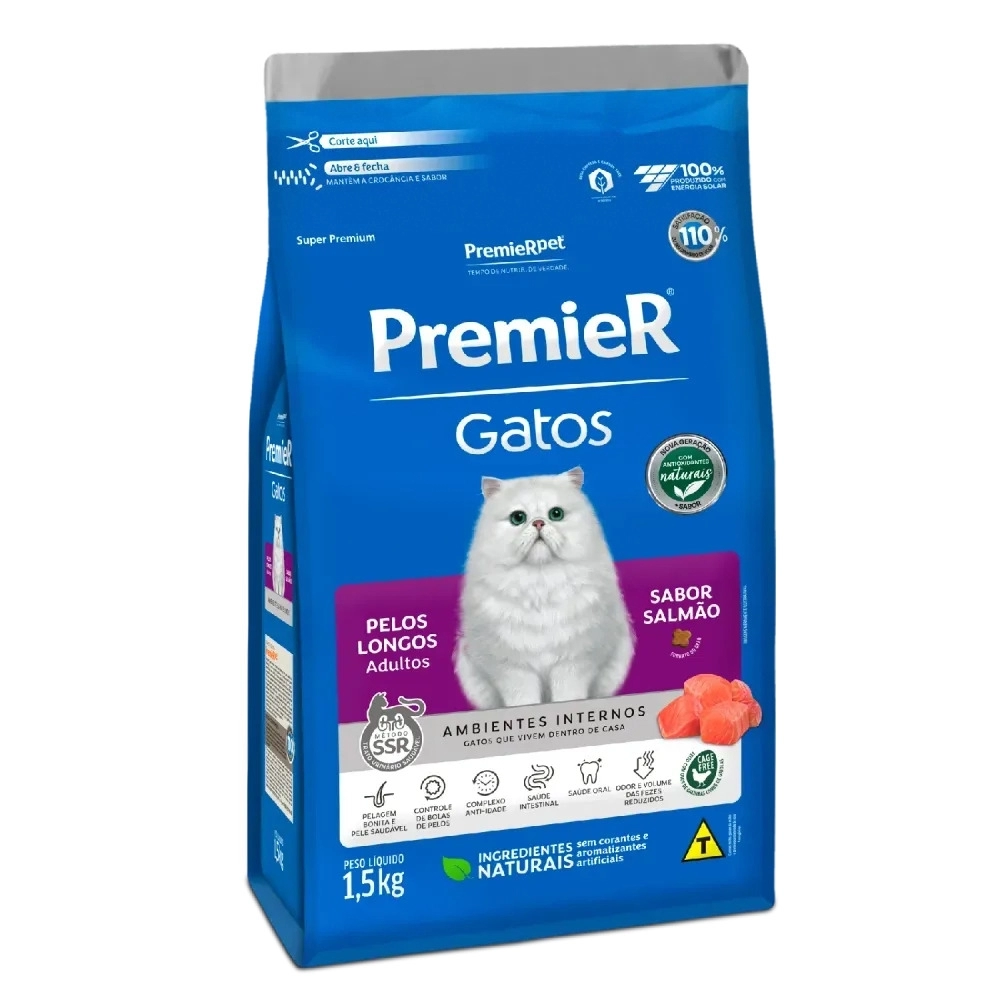PremieR Gatos Adultos Pelos Longos – Salmão oferece ao seu gato adulto de pelos longos um cuidado especial todos os dias. Através de uma combinação de ingredientes nobres, realça a beleza da pelagem, tornando-a exuberante e macia. No entanto, esses pelos densos podem predispor à formação das “bolas de pelos”, essas são resultado do acúmulo de pelos no trato digestivo pelo hábito de se lamber dos felinos. PremieR Gatos Adultos Pelos Longos – Salmão traz em sua fórmula fibras selecionadas como a aveia e polpa de beterraba que previnem a formação dessas indesejáveis “bolas de pelos”.