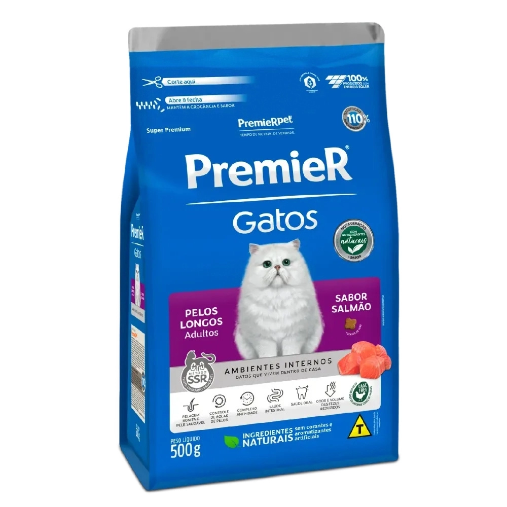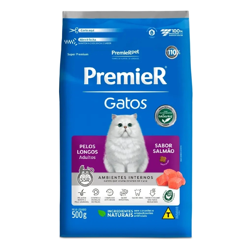 PremieR Gatos Adultos Pelos Longos – Salmão oferece ao seu gato adulto de pelos longos um cuidado especial todos os dias. Através de uma combinação de ingredientes nobres, realça a beleza da pelagem, tornando-a exuberante e macia. No entanto, esses pelos densos podem predispor à formação das “bolas de pelos”, essas são resultado do acúmulo de pelos no trato digestivo pelo hábito de se lamber dos felinos. PremieR Gatos Adultos Pelos Longos – Salmão traz em sua fórmula fibras selecionadas como a aveia e polpa de beterraba que previnem a formação dessas indesejáveis “bolas de pelos”.