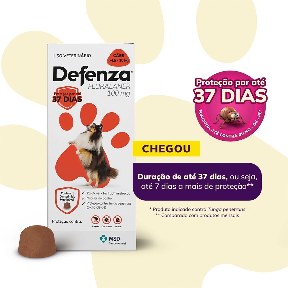 Eficaz no combate a pulgas, carrapatos e sarnas, o Defenza Antipulgas e Carrapatos dura até 37 dias, o maior tempo de ação entre as soluções mensais. Além disso, também protege contra Tunga penetrans, o bicho-de-pé, uma zoonose que pode acometer animais e humanos.