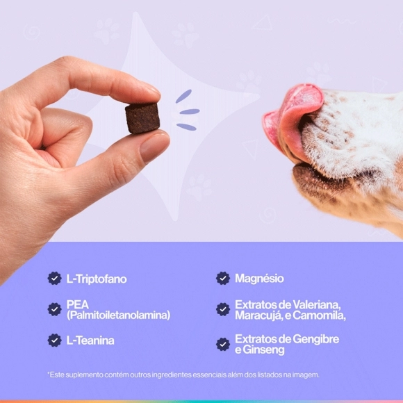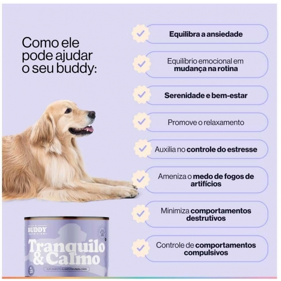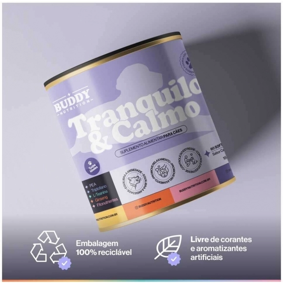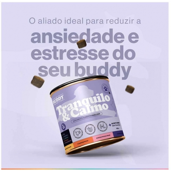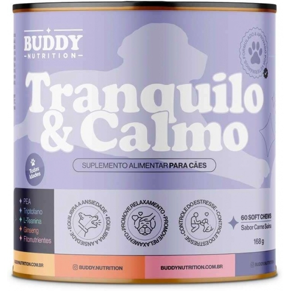 O Suplemento Alimentar Buddy Nutrition Tranquilo & Calmo para Cães é o aliado perfeito para reduzir a ansiedade e o estresse do seu pet. Desenvolvido por especialistas, combina ingredientes como Triptofano, Teanina, PEA e fitonutrientes naturais, como Camomila, Valeriana e Maracujá. Essa fórmula promove a tranquilidade, fortalecendo o bem-estar e a saúde mental do seu cãozinho. Com Buddy Nutrition, você oferece ao seu buddy uma vida mais calma e equilibrada.