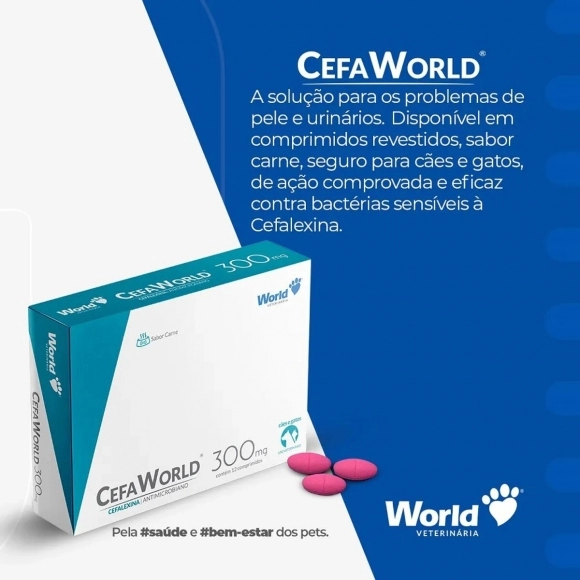 O Antibiótico CefaWorld 150mg para Cães e Gatos possui ação contra bactérias Gram-positivas e Gram-negativas sensíveis à cefalexina. Seu uso é indicado no tratamento de infecções dermatológicas, geniturinárias e intestinais, garantindo a saúde e bem-estar do seu pet.