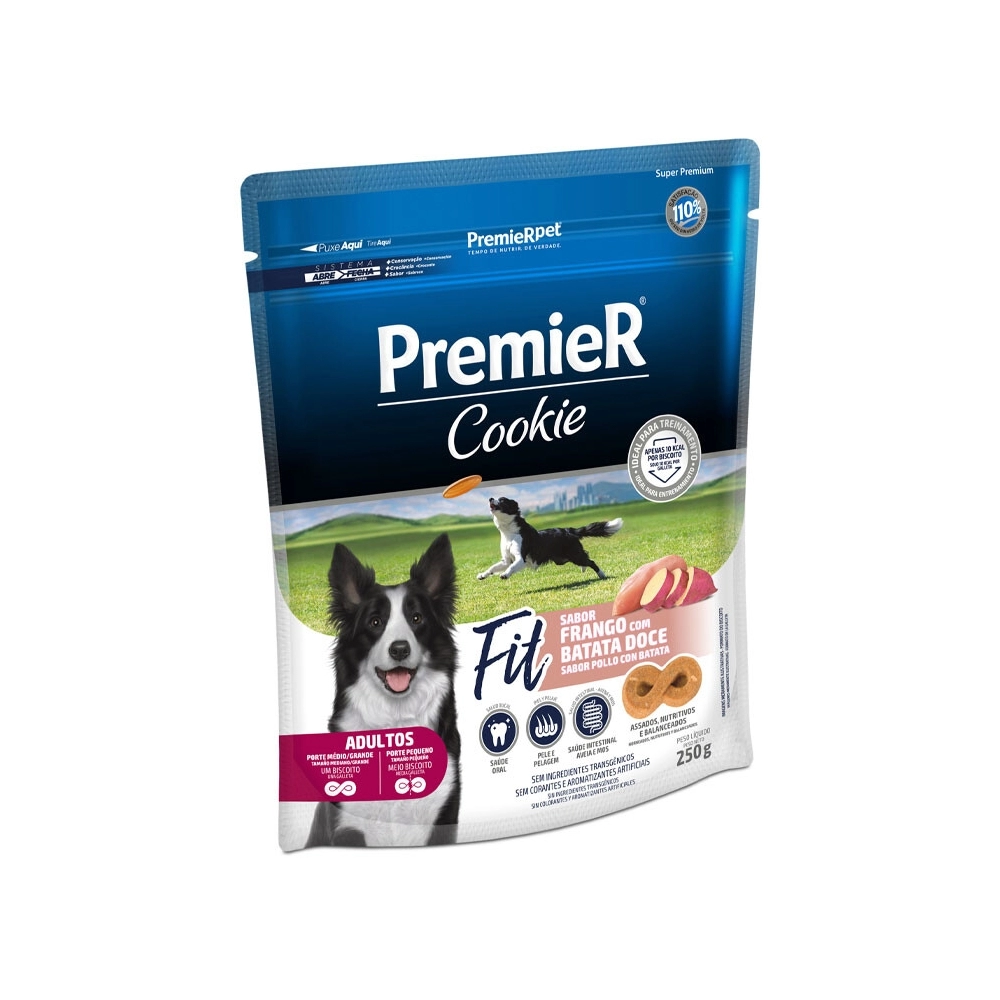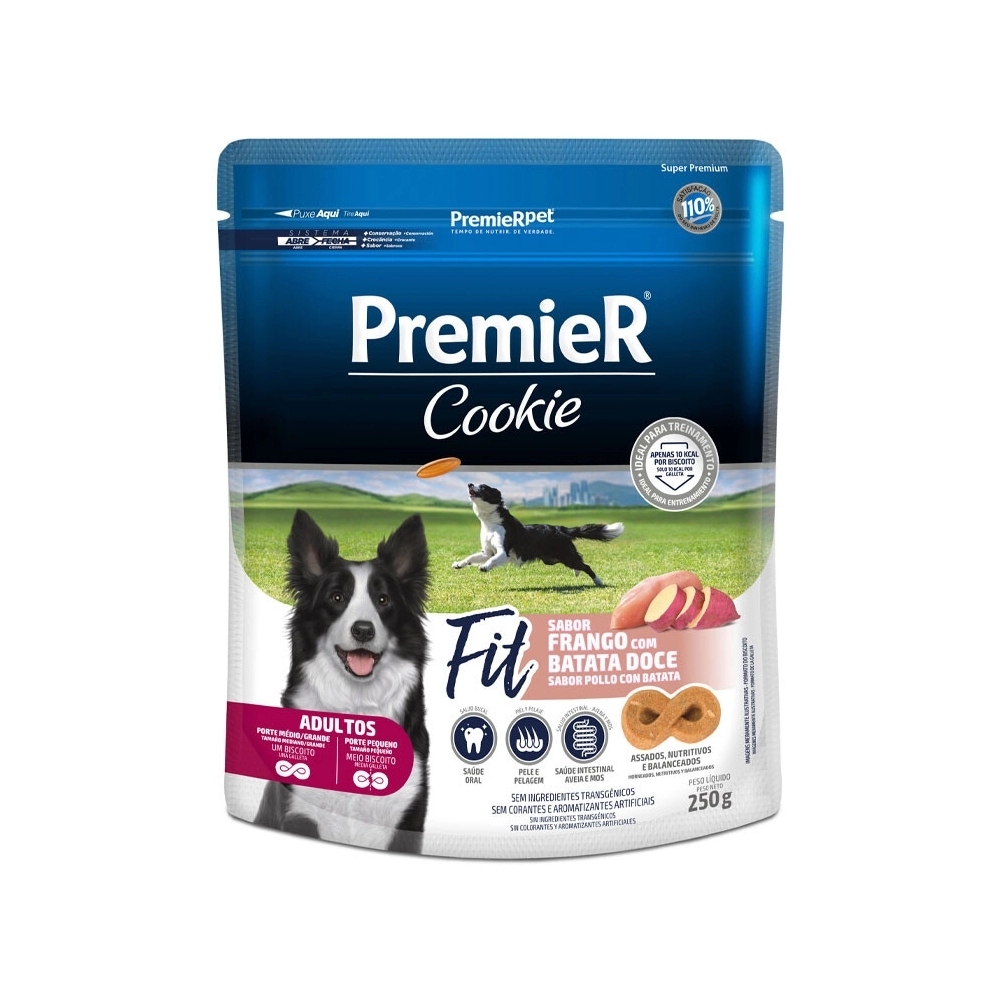 O PremieR® Cookie Fit é indicado para cães adultos de todos os portes e contém todos os benefícios da linha PremieR® Cookies. Apresenta um conceito inovador, pois além da alimentação saudável, ele também atende os cães que praticam exercícios e tem um estilo de vida ativo, aproximando ainda mais o cão e o tutor. O cookie tem apenas 10,5 calorias e pode ser utilizado como agrado, inclusive em treinamentos, uma vez que por possuir baixo valor energético, é uma ótima opção como reforço positivo.