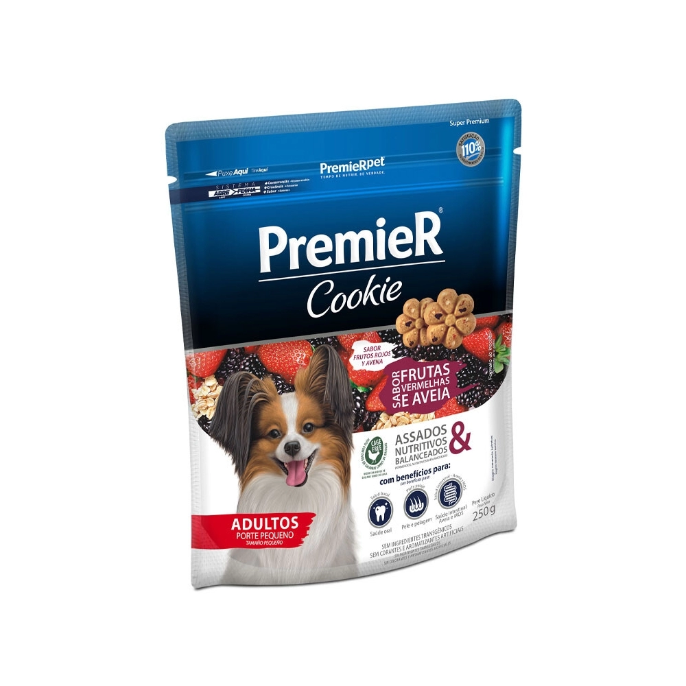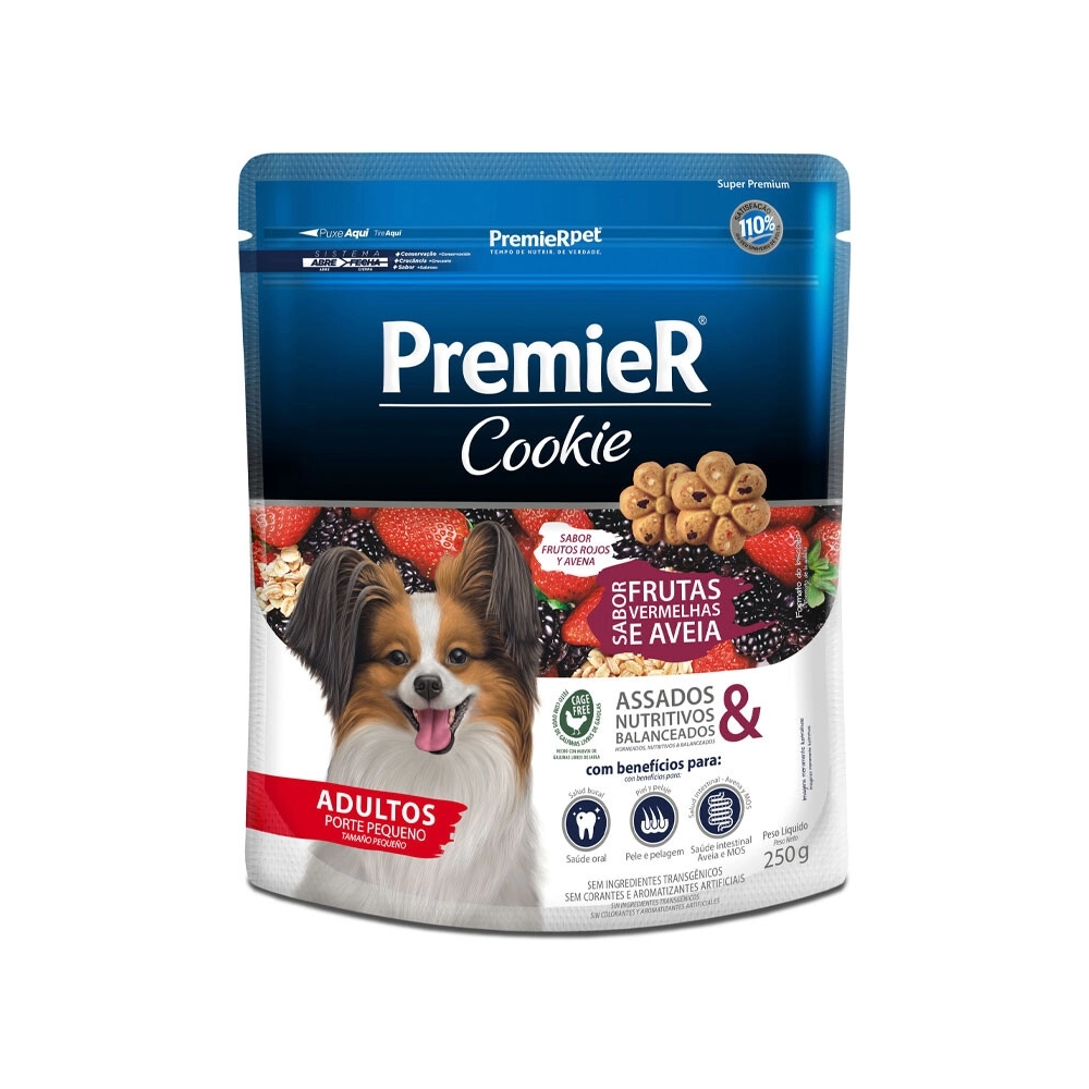 PremieR Cookie Cães Adultos Frutas Vermelhas & Aveia é indicado para cães adultos de pequeno porte e contém todos os benefícios da linha PremieR Cookies aliados à exclusiva combinação do morango, amora e aveia, ingredientes saudáveis e que promovem ainda mais sabor aos biscoitos.