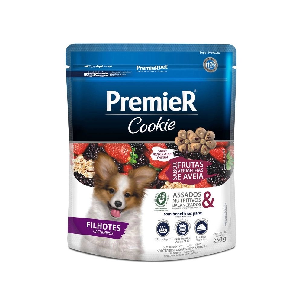 PremieR Cookie Cães Filhotes Frutas Vermelhas & Aveia é indicado para cães filhotes e contém todos os benefícios da linha PremieR Cookies aliados à exclusiva combinação do morango, amora e aveia, ingredientes saudáveis e que promovem ainda mais sabor aos biscoitos.