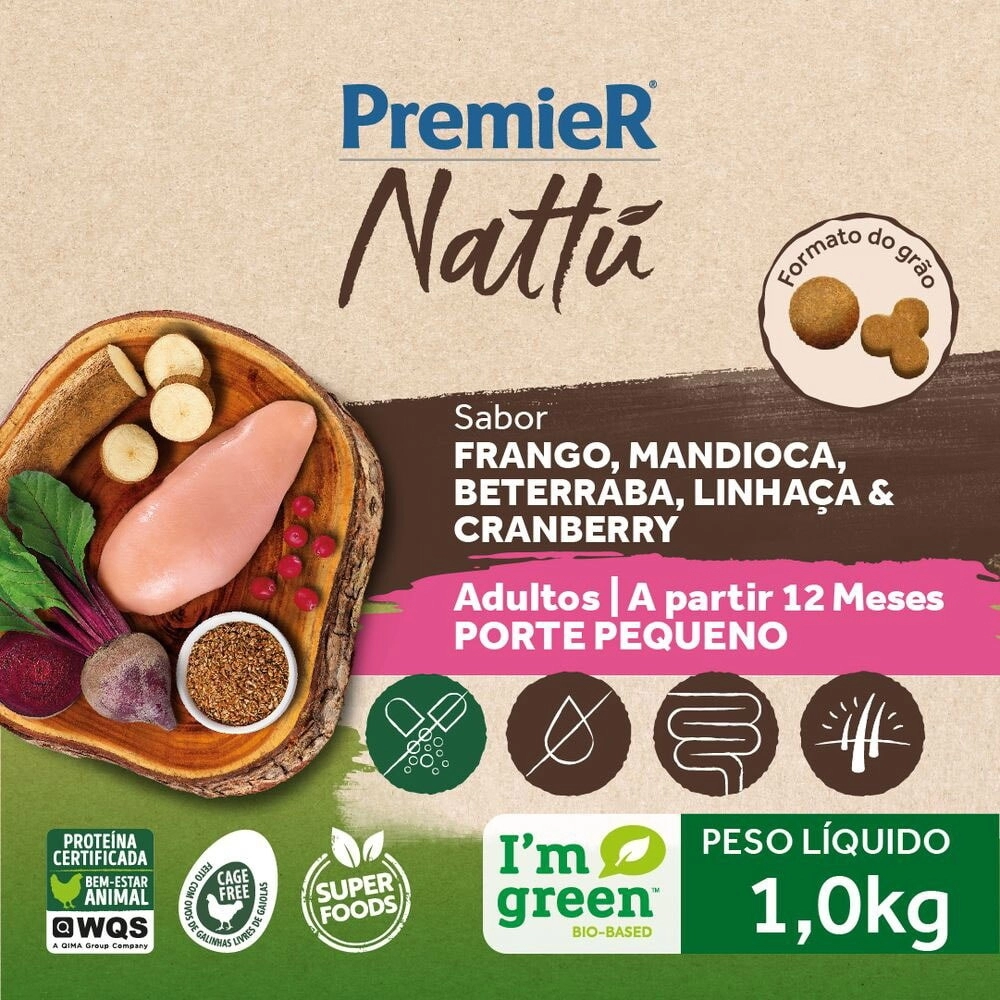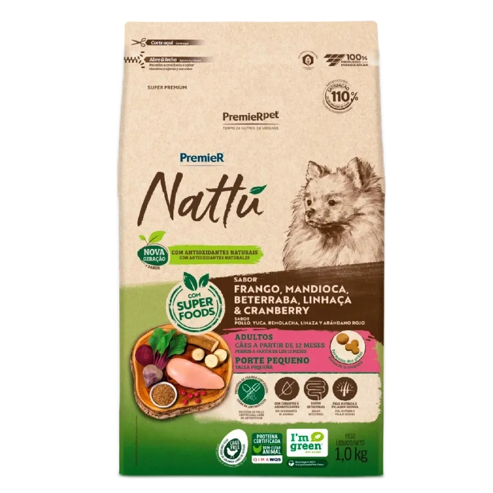Com uma fórmula sem corantes e aromatizantes, PremieR Nattu Mandioca é recomendado para a alimentação de cães adultos de pequeno porte e traz em sua base de ingredientes Frango, Mandioca, Beterraba, Linhaça e Cranberry, itens de alta densidade nutricional, que oferecem muitos nutrientes e poucas calorias, proporcionando uma dieta mais equilibrada para seu cão.