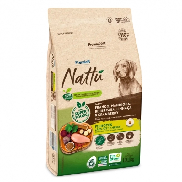 Com uma fórmula sem corantes e aromatizantes, PremieR Nattu Mandioca é recomendado para a alimentação de cães filhotes e traz em sua base de ingredientes Frango, Mandioca, Beterraba, Linhaça e Cranberry, itens de alta densidade nutricional, que oferecem muitos nutrientes e poucas calorias, proporcionando uma dieta mais equilibrada para seu cão.