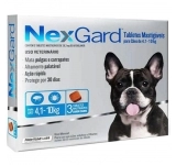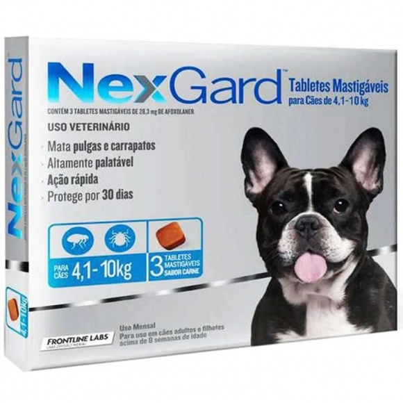 Referência no tratamento contra pulgas e carrapatos, o Antipulgas e Carrapatos NexGard 68 mg para Cães de 4,1 a 10 Kg com 3 tabletes é comprovadamente seguro para cães de qualquer raça e conta com uma linha completa para atender diferentes portes e pesos. Pode ser administrado em cães adultos e filhotes a partir de oito semanas de vida e pesando acima de 2kg. Nexgard tem um rápido início de ação e atinge 100% de eficácia em 8 horas para pulgas. O NexGard funciona por 30 dias. Para manter seu pet livre de pulgas e carrapatos, faça o tratamento mensal. NexGard: a solução na medida contra pulgas e carrapatos.