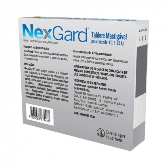 Referência no tratamento contra pulgas e carrapatos, o Antipulgas e Carrapatos NexGard 68 mg para Cães de 10,1 a 25 Kg é comprovadamente seguro para cães de qualquer raça e conta com uma linha completa para atender diferentes portes e pesos. Pode ser administrado em cães adultos e filhotes a partir de oito semanas de vida e pesando acima de 2kg. Nexgard tem um rápido início de ação e atinge 100% de eficácia em 8 horas para pulgas. O NexGard funciona por 30 dias. Para manter seu pet livre de pulgas e carrapatos, faça o tratamento mensal. NexGard: a solução na medida contra pulgas e carrapatos.