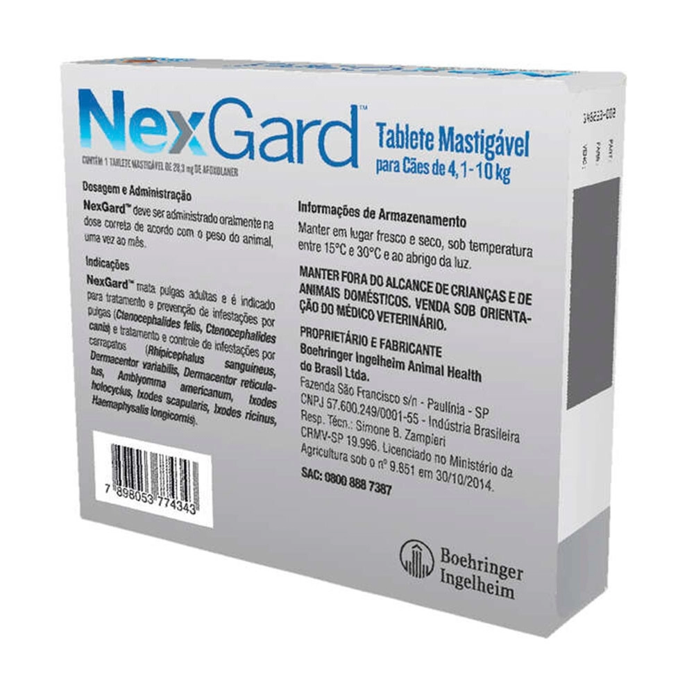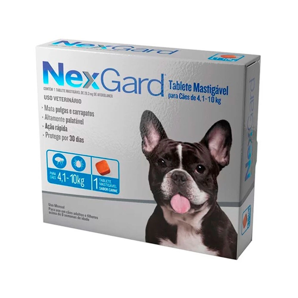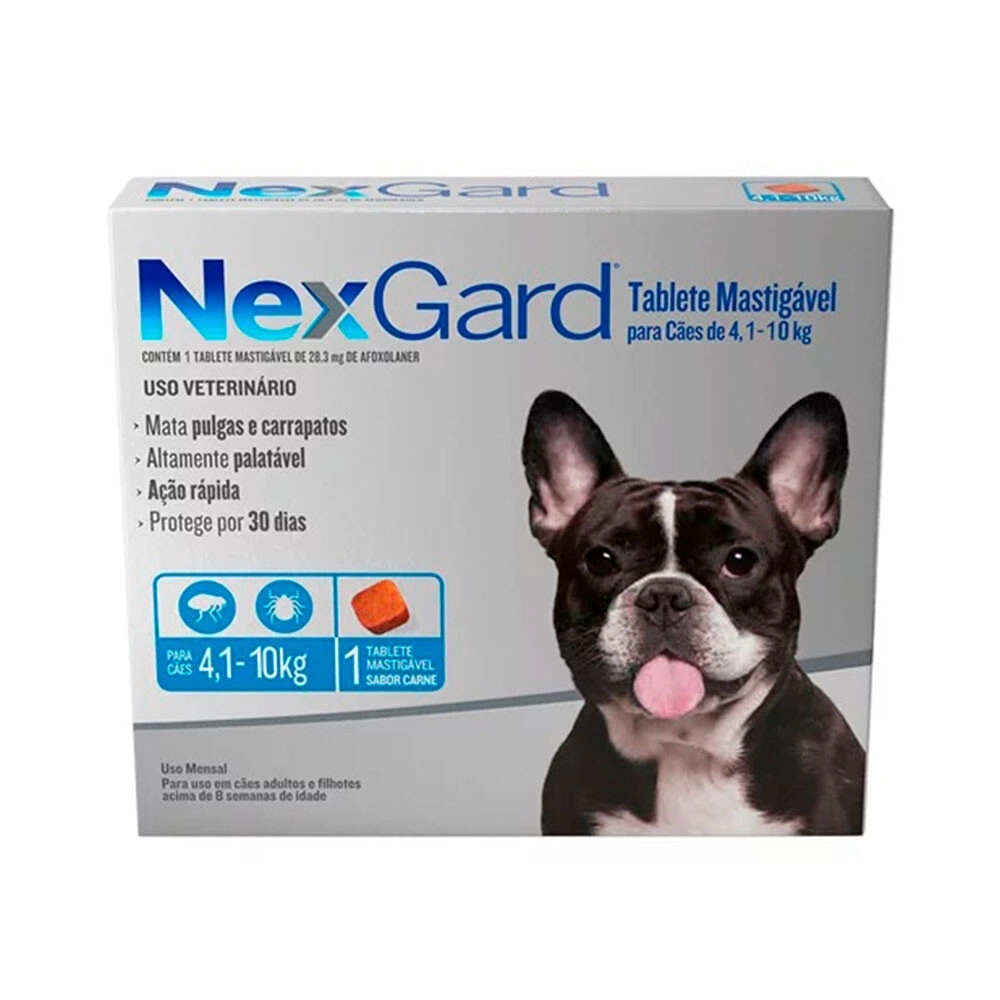 Referência no tratamento contra pulgas e carrapatos, o Antipulgas e Carrapatos NexGard 28,3 mg para Cães de 4,1 a 10 Kg é comprovadamente seguro para cães de qualquer raça e conta com uma linha completa para atender diferentes portes e pesos. Pode ser administrado em cães adultos e filhotes a partir de oito semanas de vida e pesando acima de 2kg. Nexgard tem um rápido início de ação e atinge 100% de eficácia em 8 horas para pulgas. O NexGard funciona por 30 dias. Para manter seu pet livre de pulgas e carrapatos, faça o tratamento mensal. NexGard: a solução na medida contra pulgas e carrapatos.