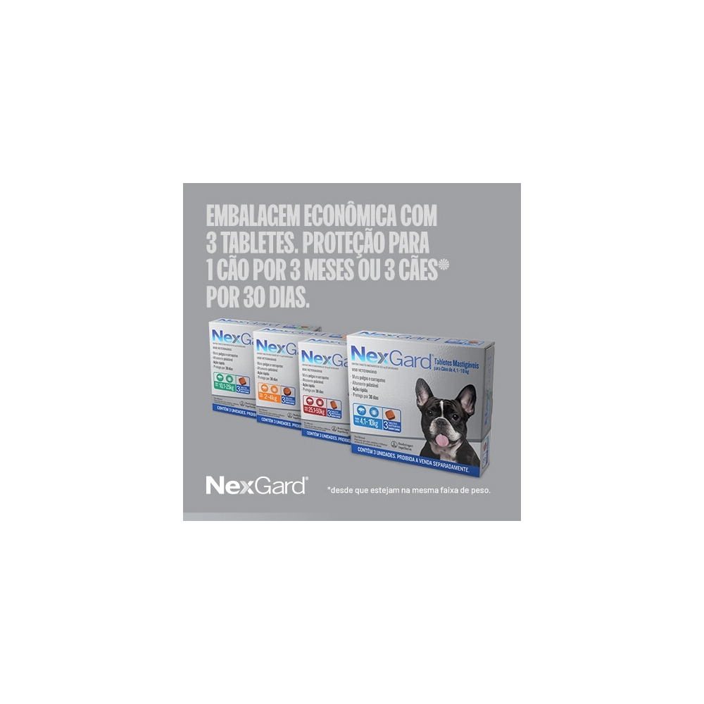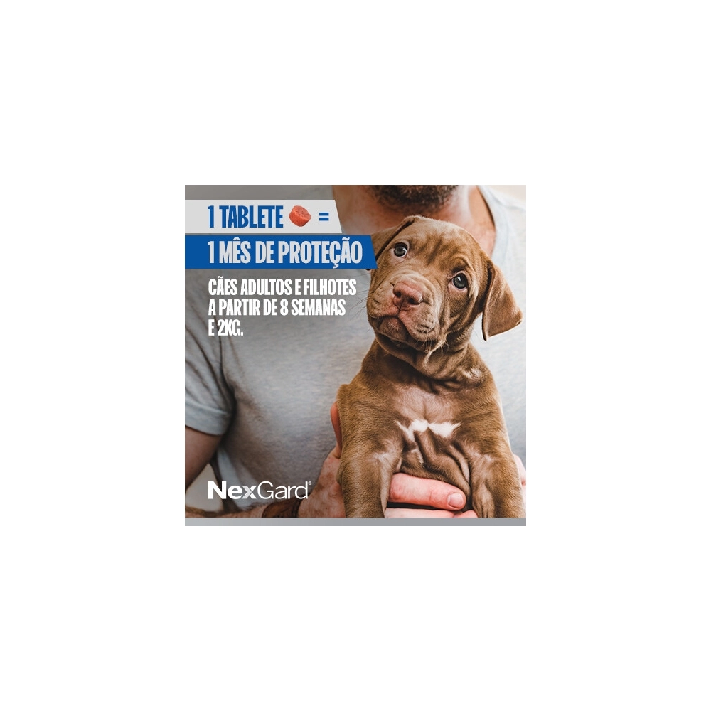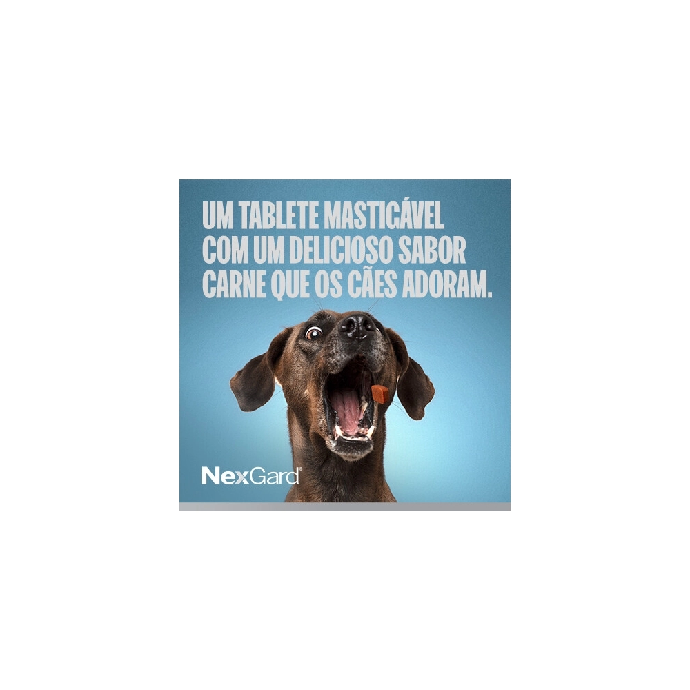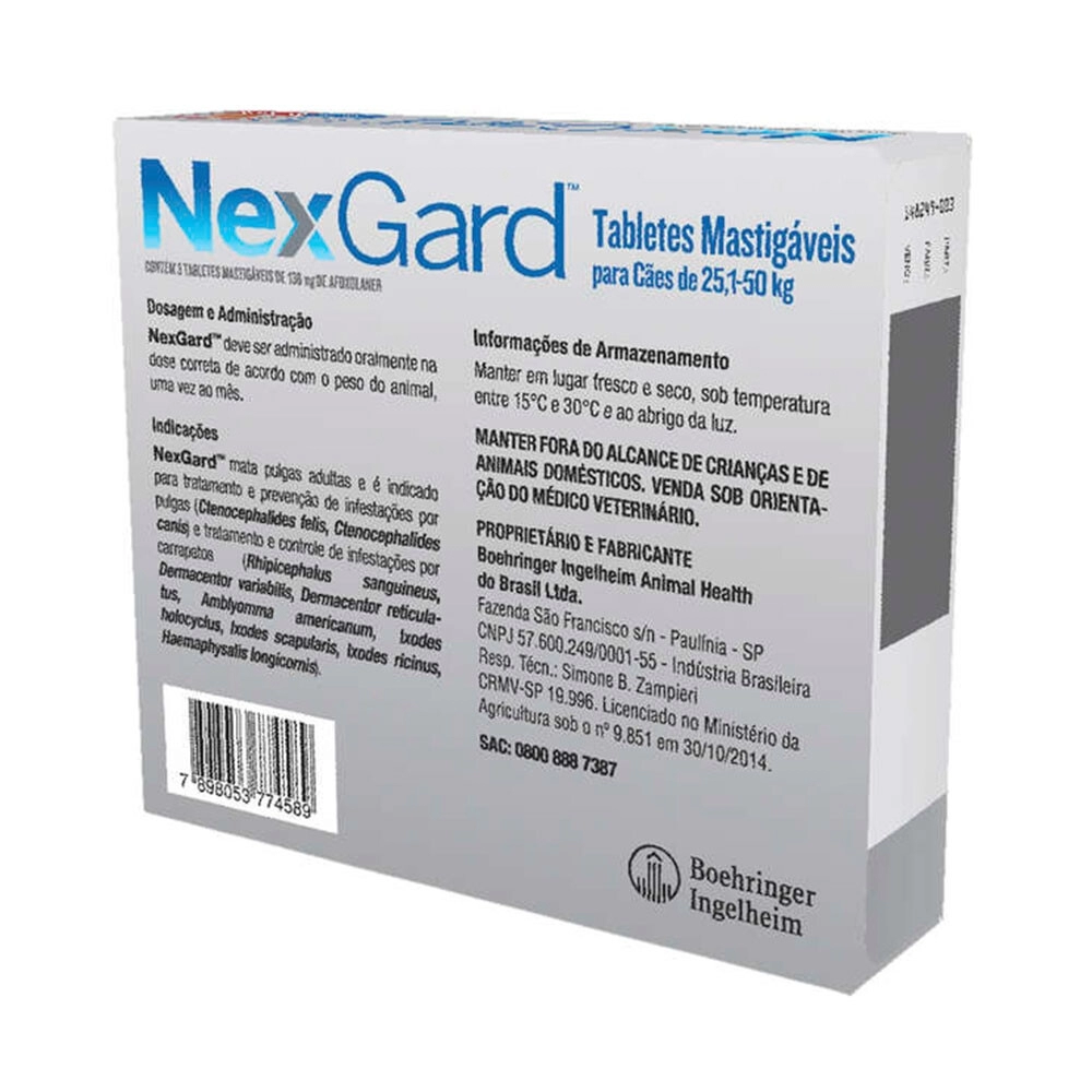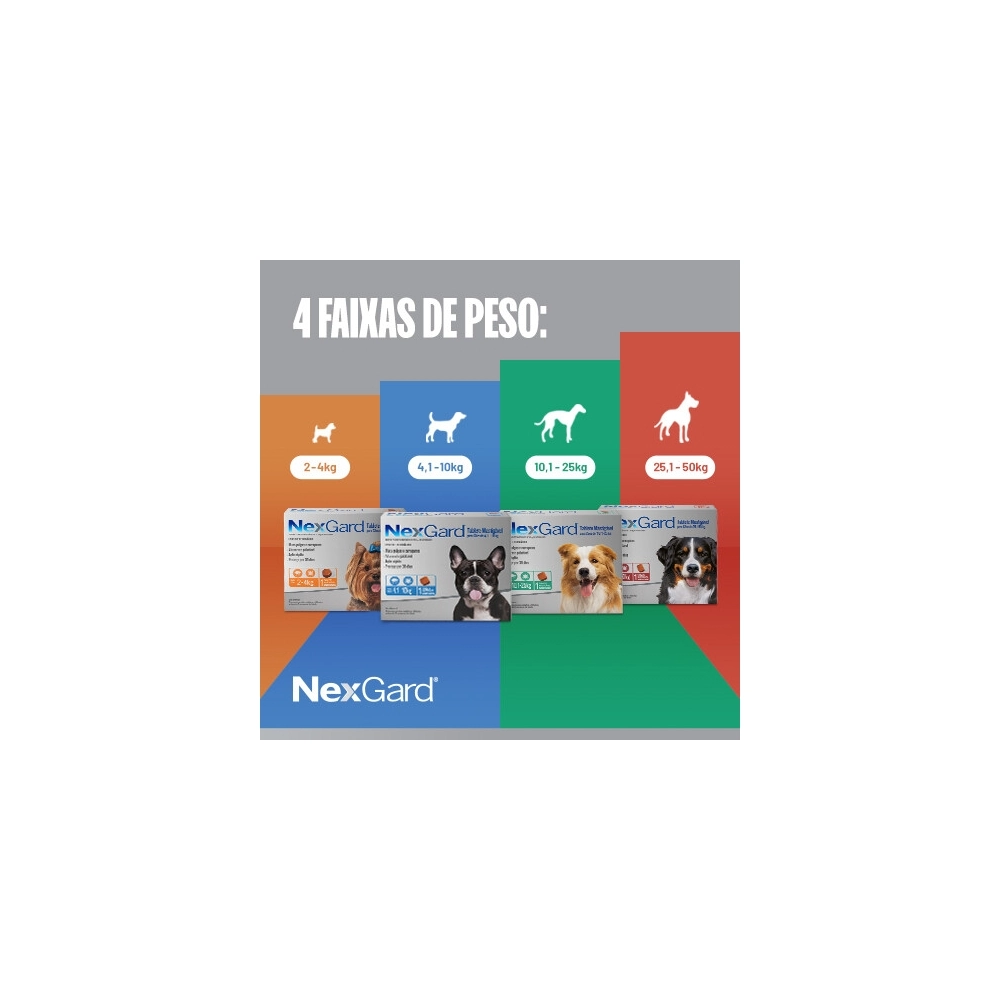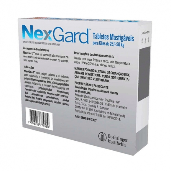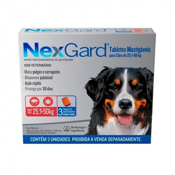 Referência no tratamento contra pulgas e carrapatos, o Antipulgas e Carrapatos NexGard 136 mg para Cães de 25,1 a 50 Kg com 3 tabletes é comprovadamente seguro para cães de qualquer raça e conta com uma linha completa para atender diferentes portes e pesos. Pode ser administrado em cães adultos e filhotes a partir de oito semanas de vida e pesando acima de 2kg. Nexgard tem um rápido início de ação e atinge 100% de eficácia em 8 horas para pulgas. O NexGard funciona por 30 dias. Para manter seu pet livre de pulgas e carrapatos, faça o tratamento mensal. NexGard: a solução na medida contra pulgas e carrapatos.