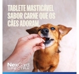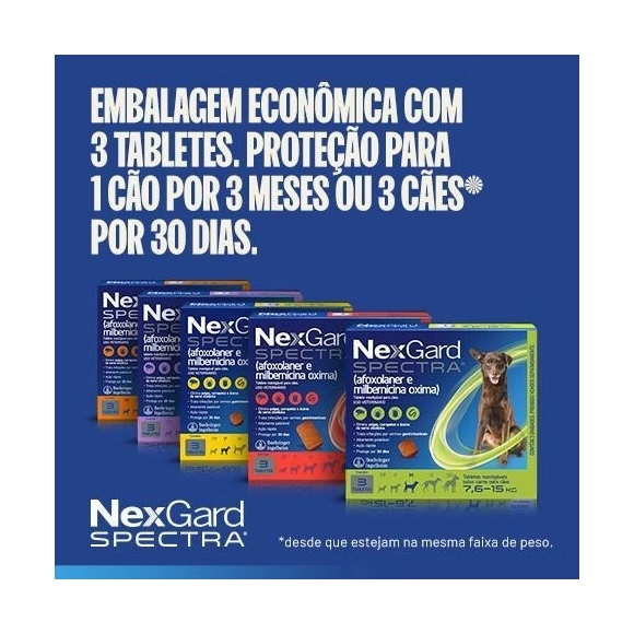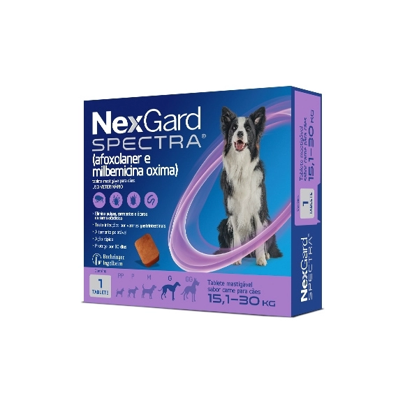 O NexGard Spectra para Cães 15,1kg a 30kg é um tablete mastigável, altamente palatável com sabor de carne, e garante proteção por até 30 dias com apenas uma dose. Segundo a bula do Nexgard Spectra, o remédio tem ação rápida e atinge 100% de eficácia em 8 horas para pulgas. É seguro e pode ser usado por cães em todas as fases da vida a partir de oito semanas de idade com peso superior a 2kg.