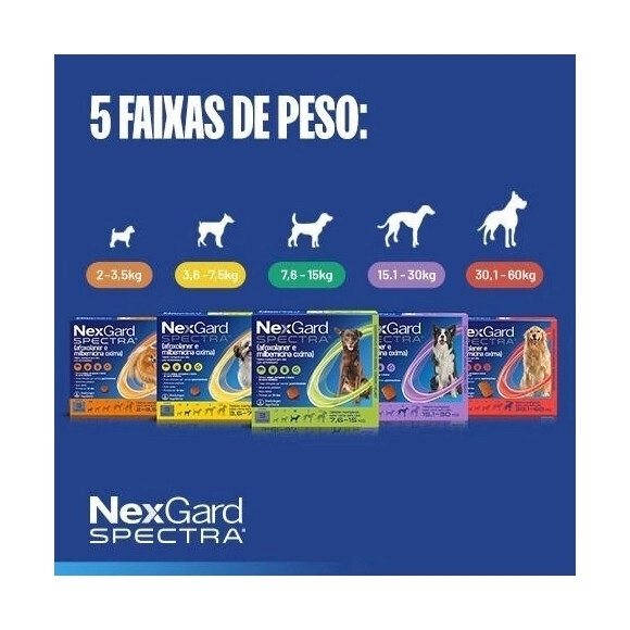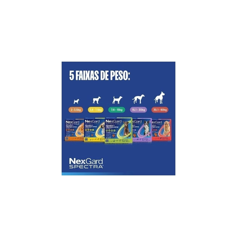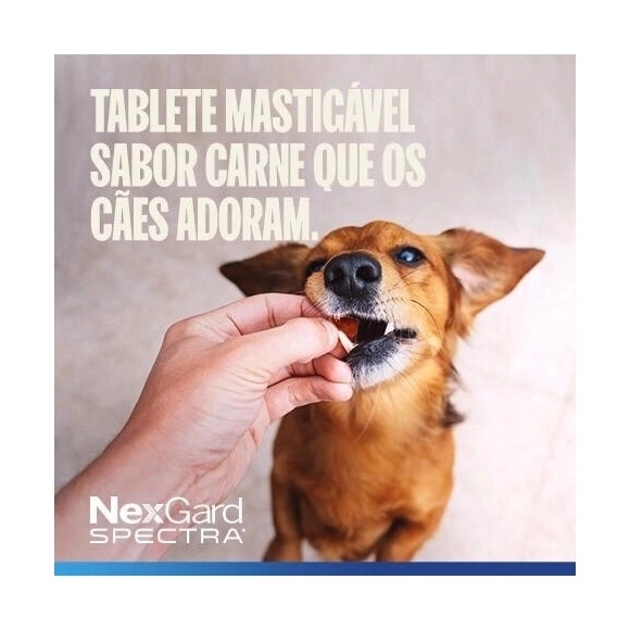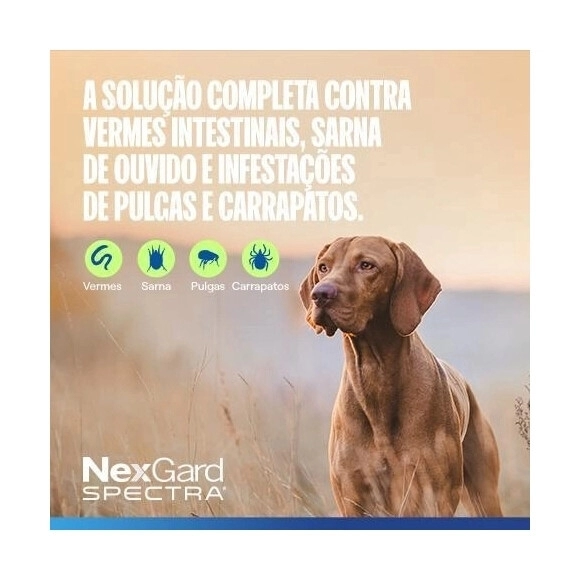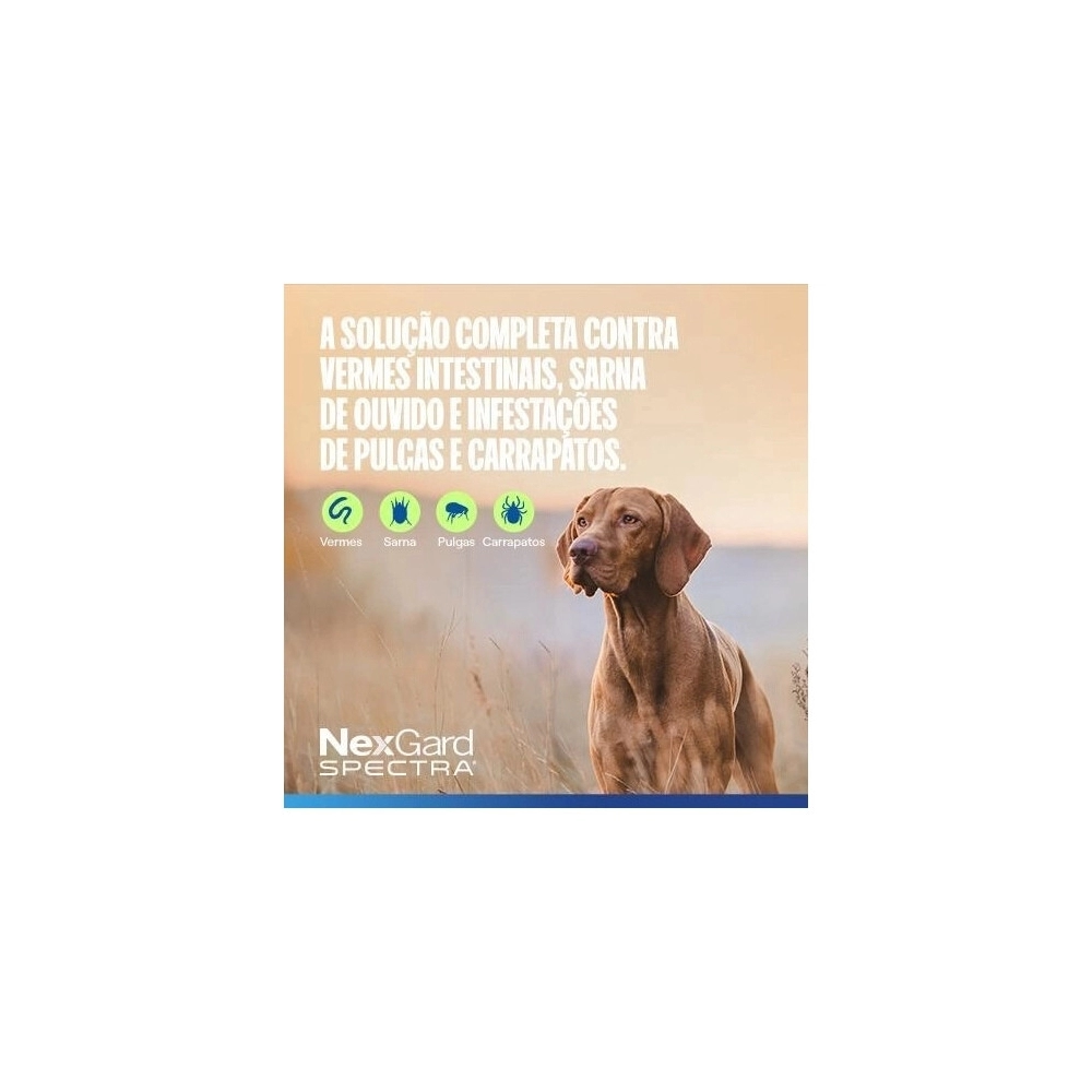 Além da ação antipulgas e carrapaticida, o NexGard Spectra possui atividade vermífuga de amplo espectro, atuando contra vermes intestinais como lombrigas e ancilostomídeos, além de auxiliar na prevenção do verme do coração. O produto também contribui para o controle de ácaros responsáveis por problemas dermatológicos como Sarna Demodécica, Sarna Sarcóptica e Otodécica. Seu comprimido mastigável altamente palatável facilita a administração, tornando o tratamento mais simples para tutores e profissionais veterinários.