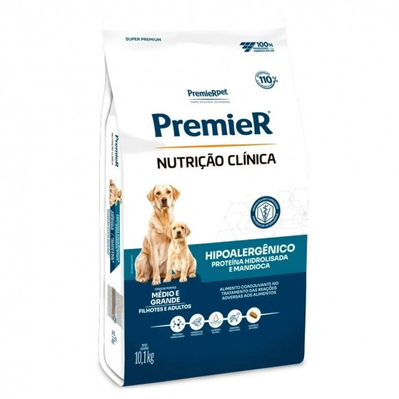 PremieR Nutrição Clínica Hipoalergênico Proteína Hidrolisada e Mandioca é um alimento auxiliar para o tratamento de cães adultos e filhotes com reação adversa ao alimento que apresente sintomatologia dermatológica e/ou intestinal.