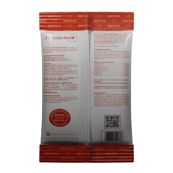 Os Bifinhos Bem-me-Pet Nutrisco contribuem para a higiene bucal do seu pet. Contém vitaminas A, D3, E, K3, B1, B2 e B6, além de probióticos. Esses snacks são livres de transgênicos, buscando sempre a saúde do seu pet!