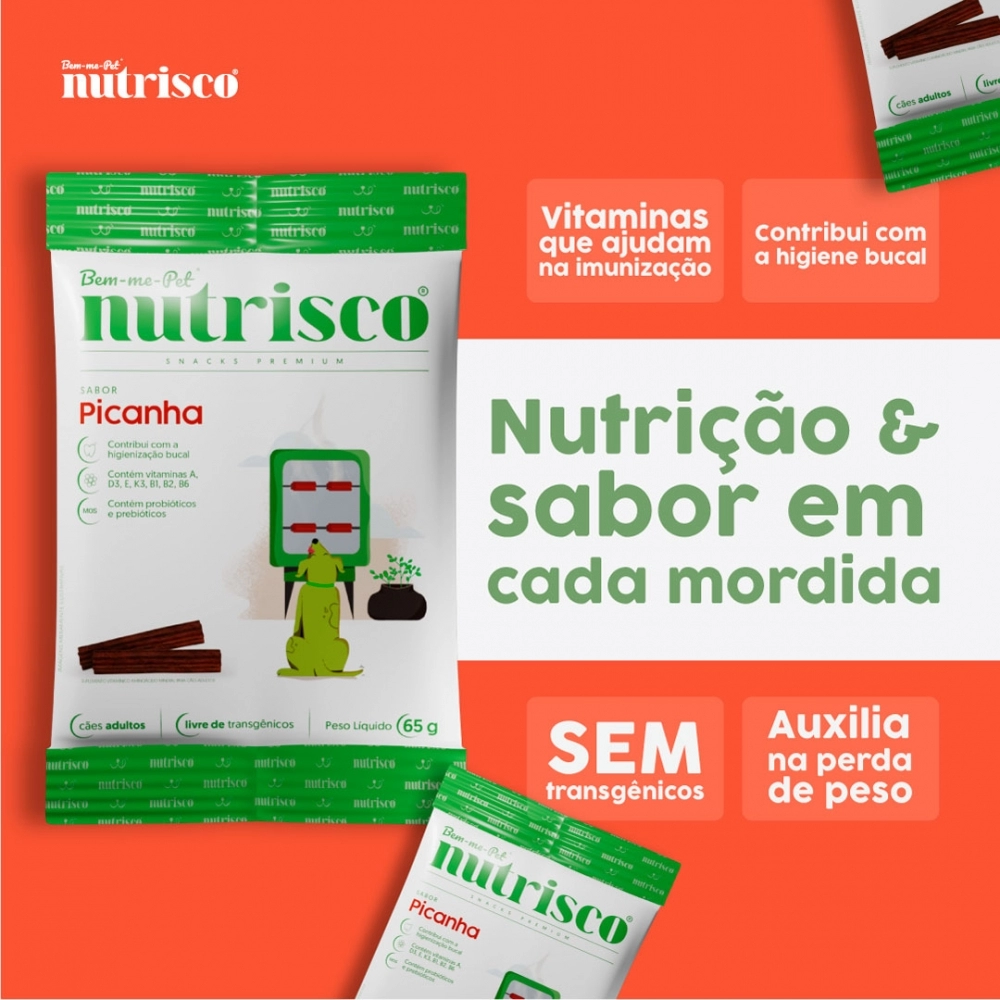 Os Snacks Bem-me-Pet Nutrisco contribuem para a higiene bucal do seu pet. Contém vitaminas A, D3, E, K3, B1, B2 e B6, além de probióticos. Os Mesmos são livres de transgênicos, buscando sempre a saúde do seu pet!