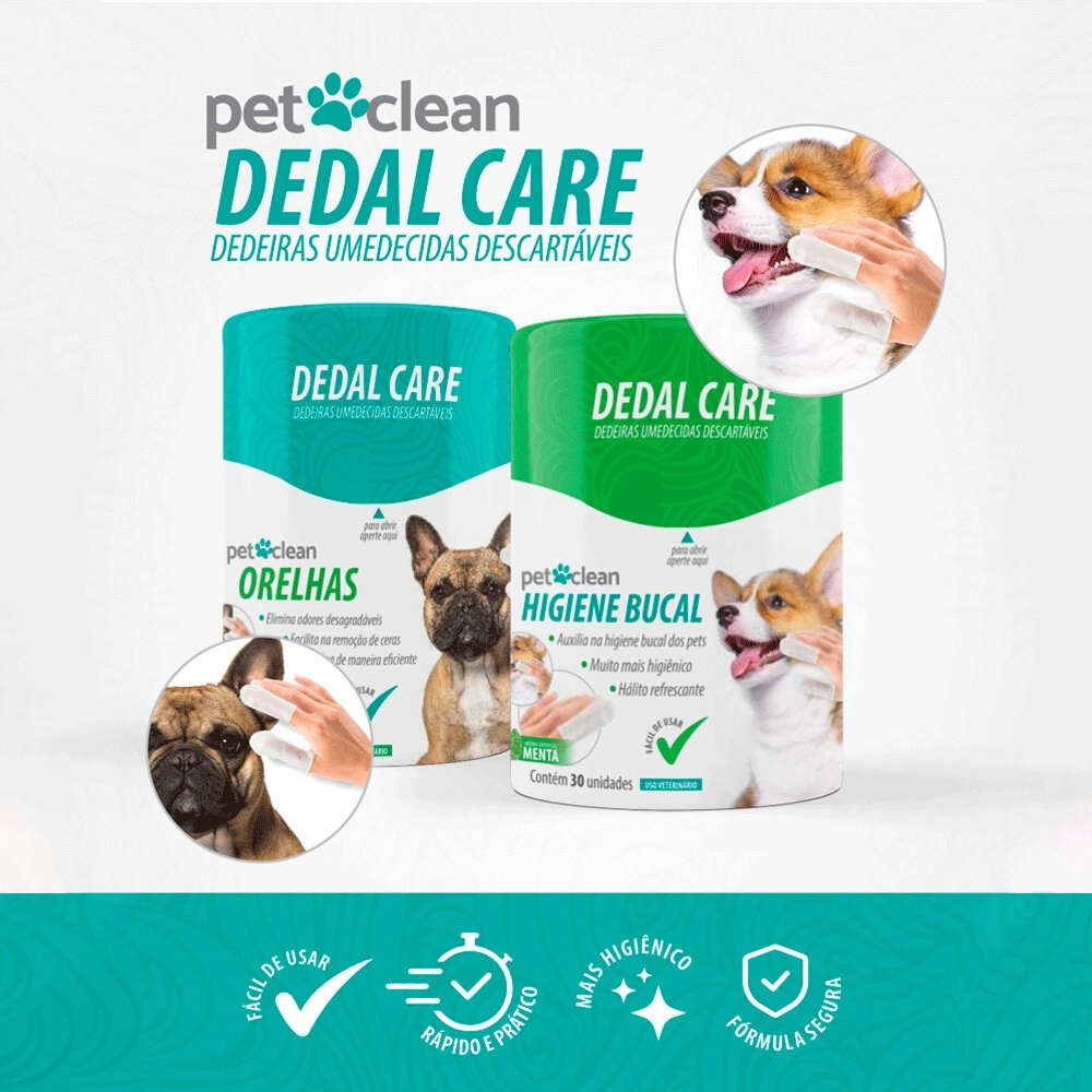 O Dedal Care auricular Pet Clean é uma dedeira umedecida descartável, muito fácil de usar, auxiliando na higienização, trazendo bem-estar e deixando um cheirinho suave de talco.
