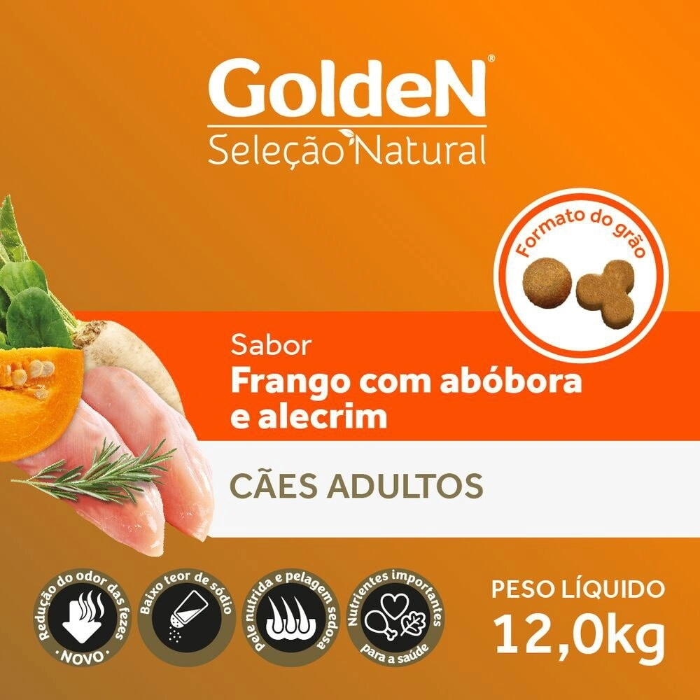 Contém nutrientes importantes para a saúde (ingredientes ricos em carotenoides, fibras e minerais), baixo teor de sódio para ressaltar o sabor natural dos ingredientes, sem corantes e aromatizantes artificiais e sem ingredientes transgênicos, a linha Golden Seleção Natural é a melhor escolha para que seu pet tenha uma alimentação de acordo com seu estilo de vida. Golden Seleção Natural, saudável como seu estilo de vida.