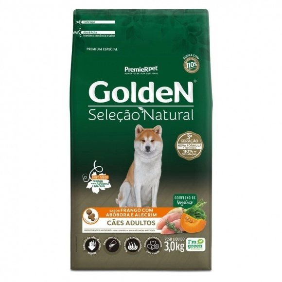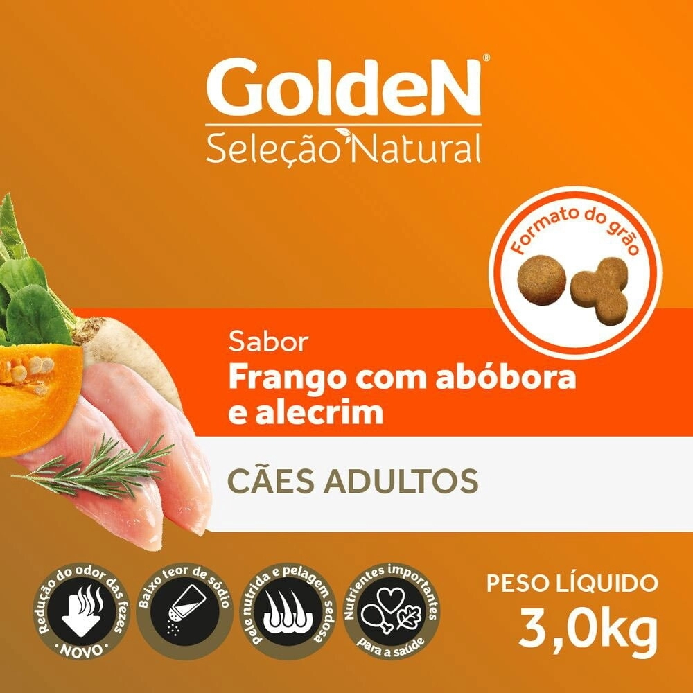 Contém nutrientes importantes para a saúde (ingredientes ricos em carotenoides, fibras e minerais), baixo teor de sódio para ressaltar o sabor natural dos ingredientes, sem corantes e aromatizantes artificiais e sem ingredientes transgênicos, a linha Golden Seleção Natural é a melhor escolha para que seu pet tenha uma alimentação de acordo com seu estilo de vida. Golden Seleção Natural, saudável como seu estilo de vida.