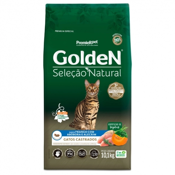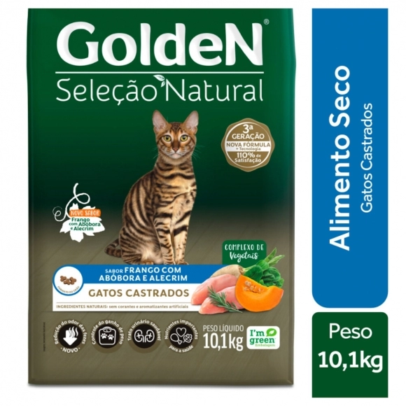 Contém nutrientes importantes para a saúde (ingredientes ricos em fibras e minerais), baixo teor de sódio para ressaltar o sabor natural dos ingredientes, sem corantes e aromatizantes artificiais e sem ingredientes transgênicos. Golden Seleção Natural Gatos Castrados Abóbora e Alecrim contém L-carnitina e teores reduzidos de calorias e gorduras para o controle de ganho de peso, além de minerais balanceados e controle do pH urinário para um trato urinário saudável.
