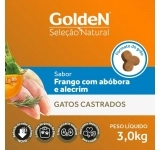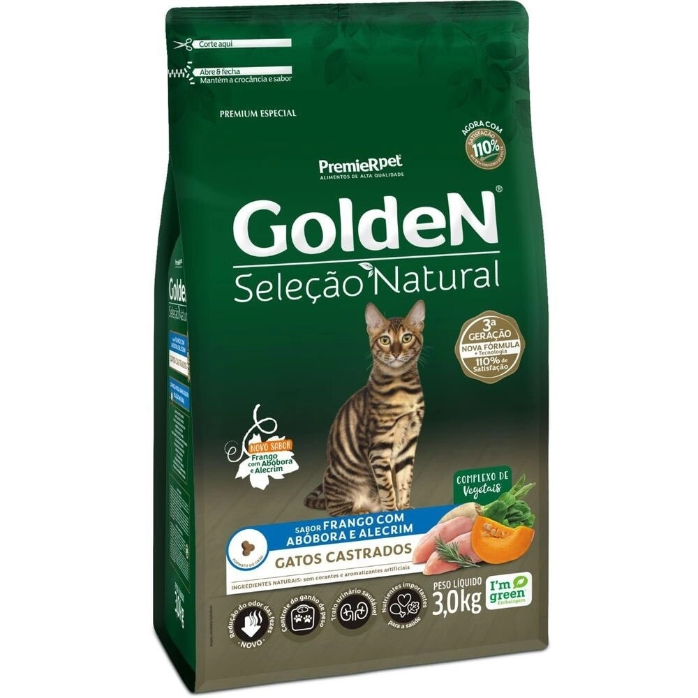 Contém nutrientes importantes para a saúde (ingredientes ricos em fibras e minerais), baixo teor de sódio para ressaltar o sabor natural dos ingredientes, sem corantes e aromatizantes artificiais e sem ingredientes transgênicos. Golden Seleção Natural Gatos Castrados Abóbora e Alecrim contém L-carnitina e teores reduzidos de calorias e gorduras para o controle de ganho de peso, além de minerais balanceados e controle do pH urinário para um trato urinário saudável.