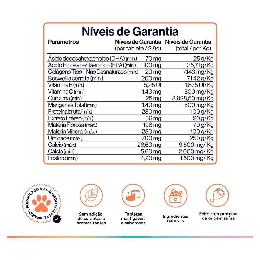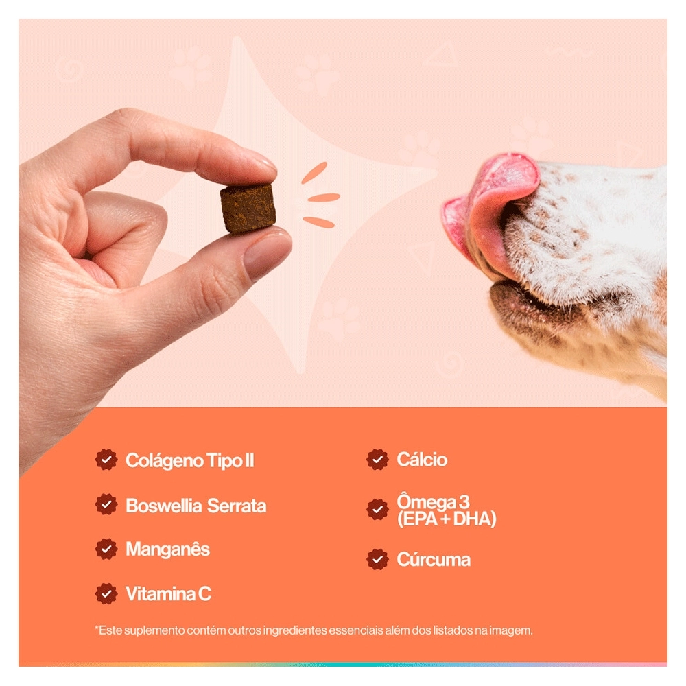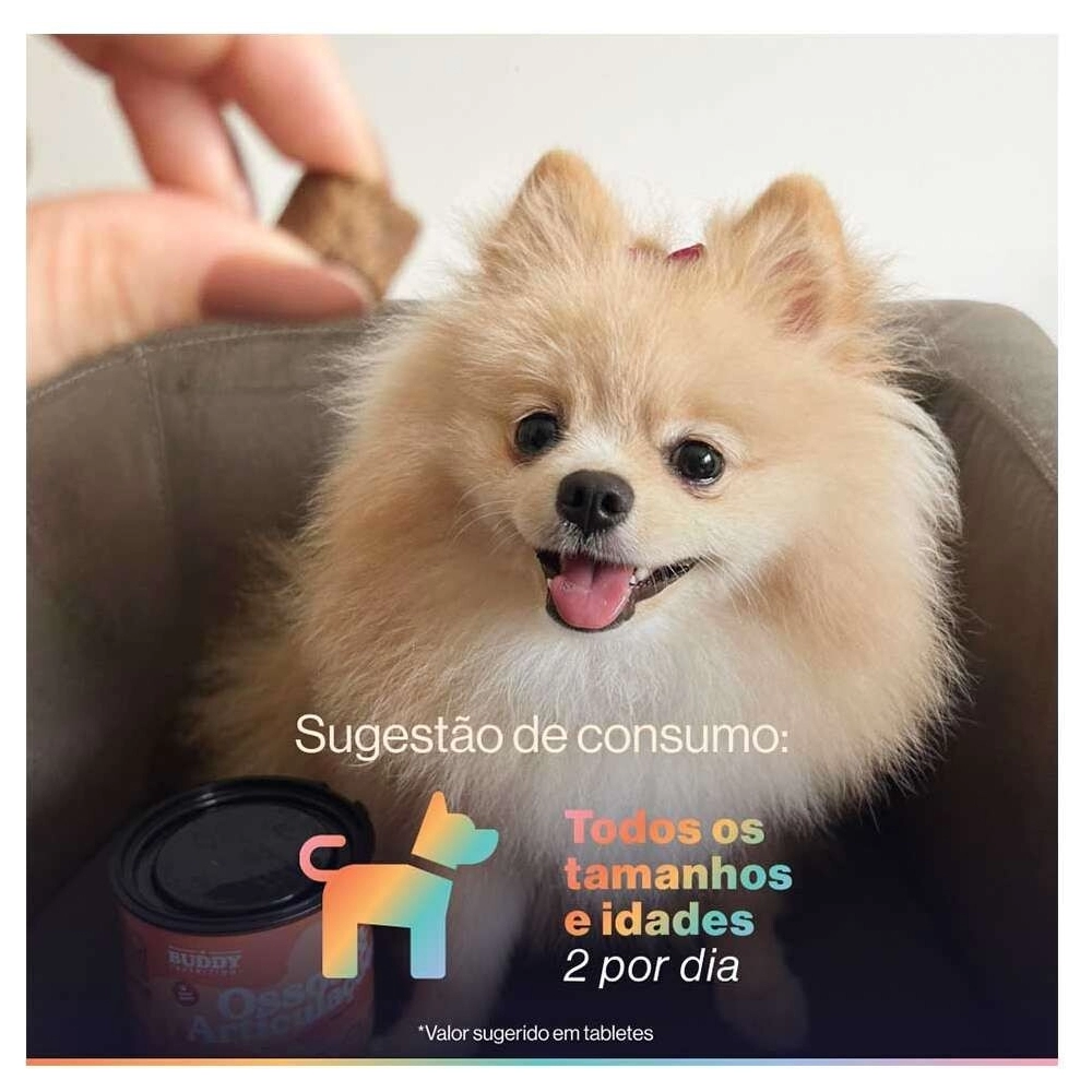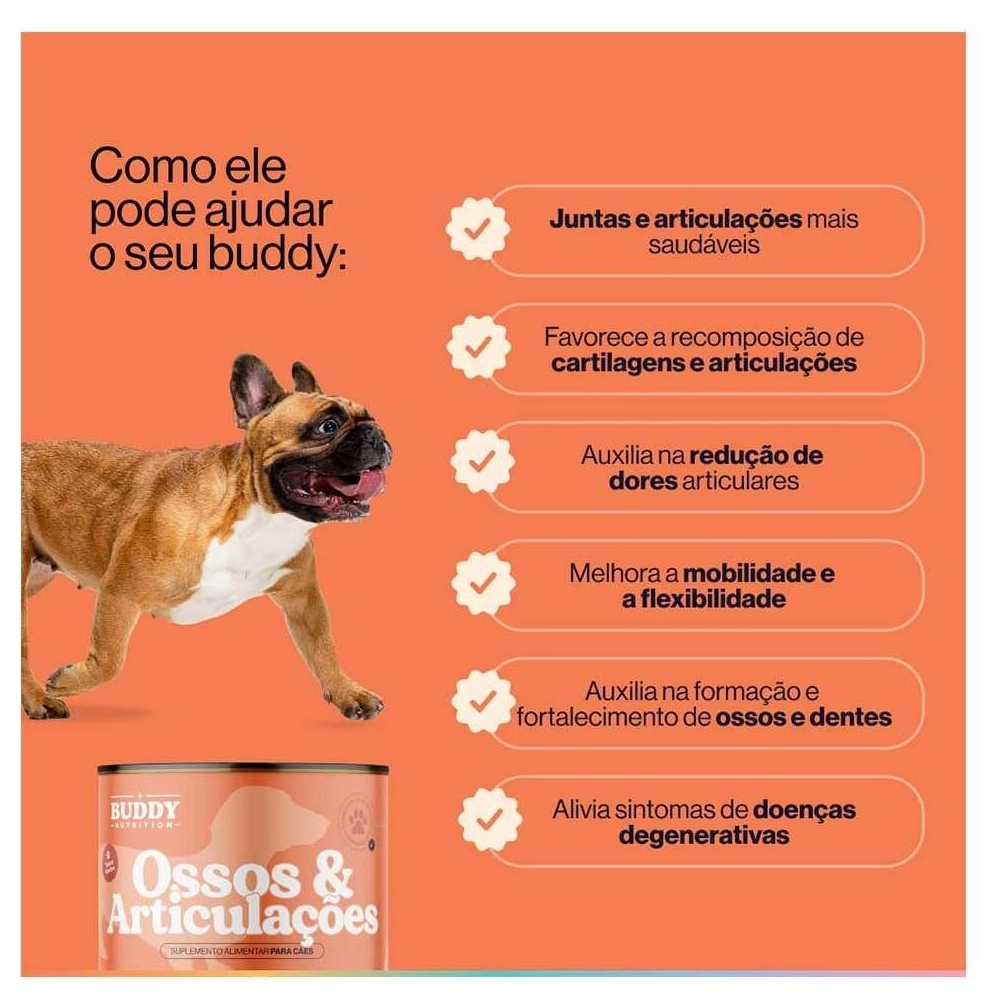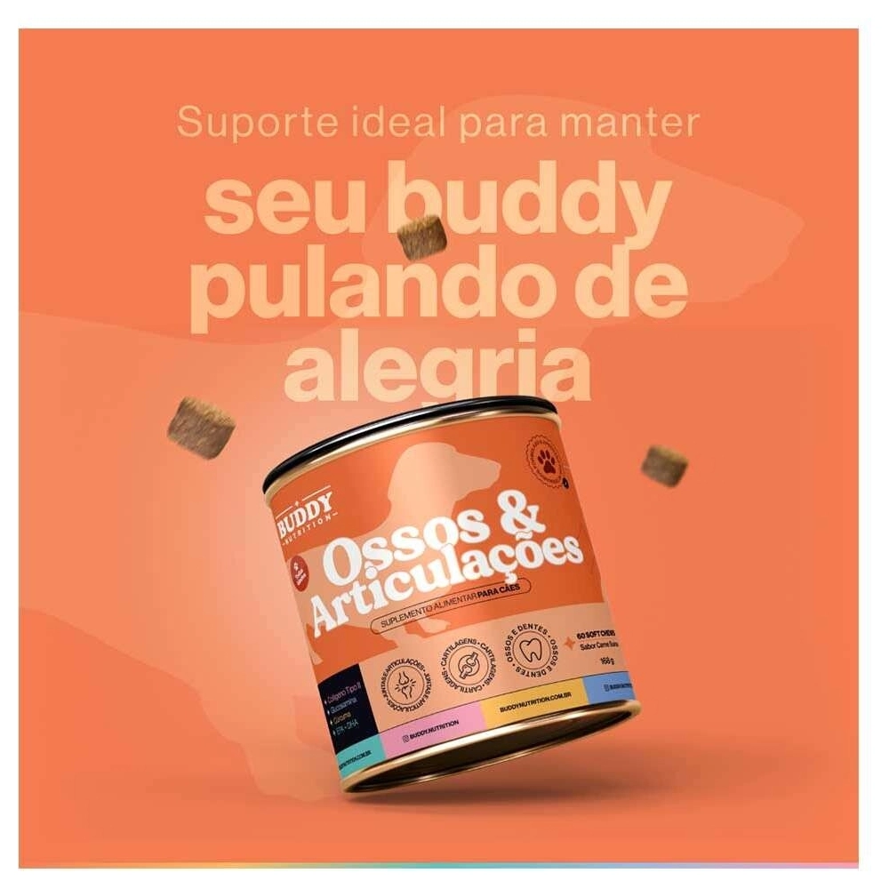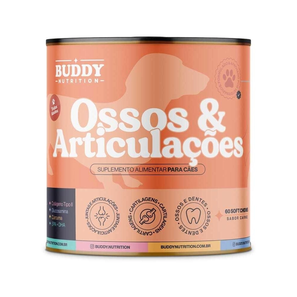 O Suplemento Alimentar Buddy Nutrition Ossos & Articulações para Cães foi especialmente formulado por especialistas em saúde canina para fortalecer ossos, dentes e articulações. Com ingredientes que promovem a formação óssea saudável e auxiliam na regeneração das cartilagens, este suplemento é essencial para manter a mobilidade e vitalidade do seu cão em todas as fases da vida. Ideal para cães de todas as idades, ajuda a garantir uma vida ativa e cheia de energia.