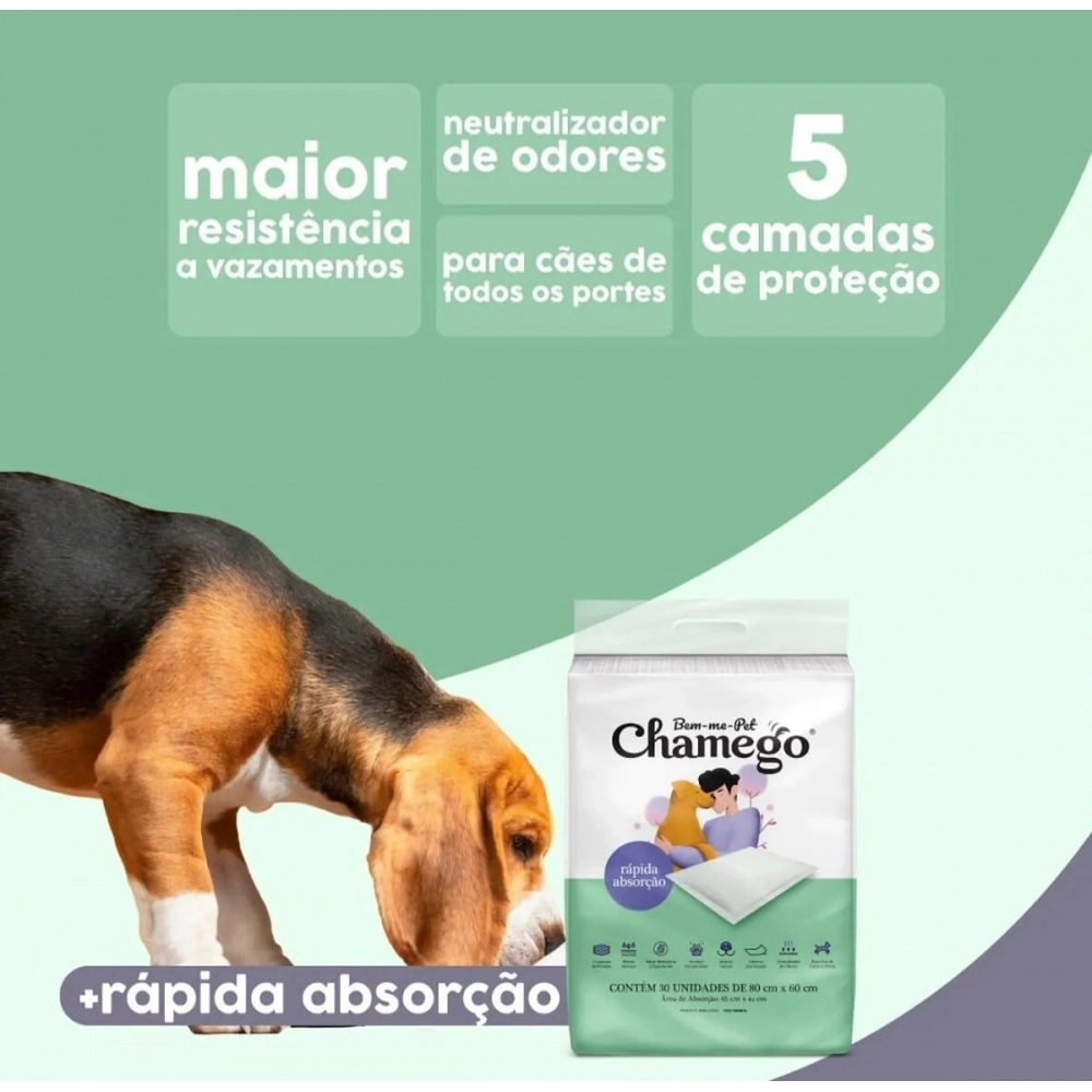 O Tapete Higiênico Chamego foi desenvolvido para oferecer praticidade e higiene no dia a dia com seu pet. Com tamanho de 80x60cm, ele atende desde filhotes em treinamento até cães adultos de médio e grande porte.