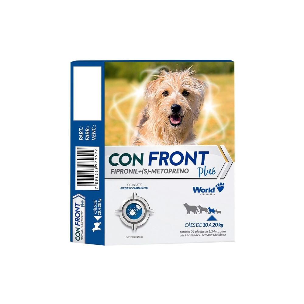 O Antipulgas e Carrapatos World Veterinária ConFront Plus para Cães de 10 a 20 Kg é uma pipeta antiparasitária composta por fipronil + (s) metopreno. Especialmente formulada para o controle e combate de infestações por pulgas e carrapatos, essa solução inibe todas as fases do ciclo de vida desses ectoparasitas, incluindo ovos, pupas, larvas e adultos.